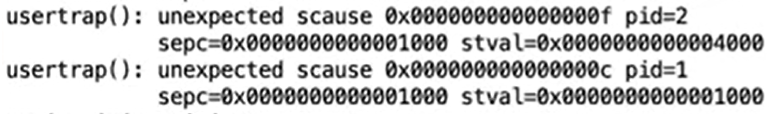 我们想要获得一个 scause 为 13 或者 15 的错误,因为我们清除了父进程和子进程页表的读权限,所以当程序访问数据的时候,理应会有该错误。