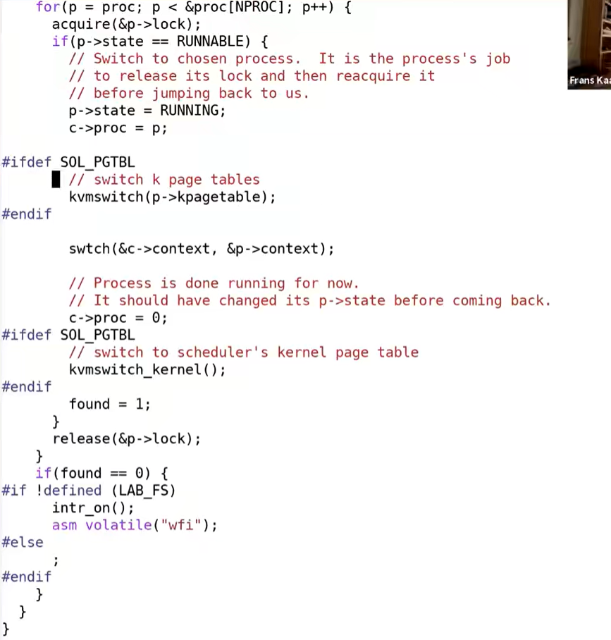 问题:下图代码中,kvmswitch(p->kpagetable),我们为什么要切换到当前进程的页表