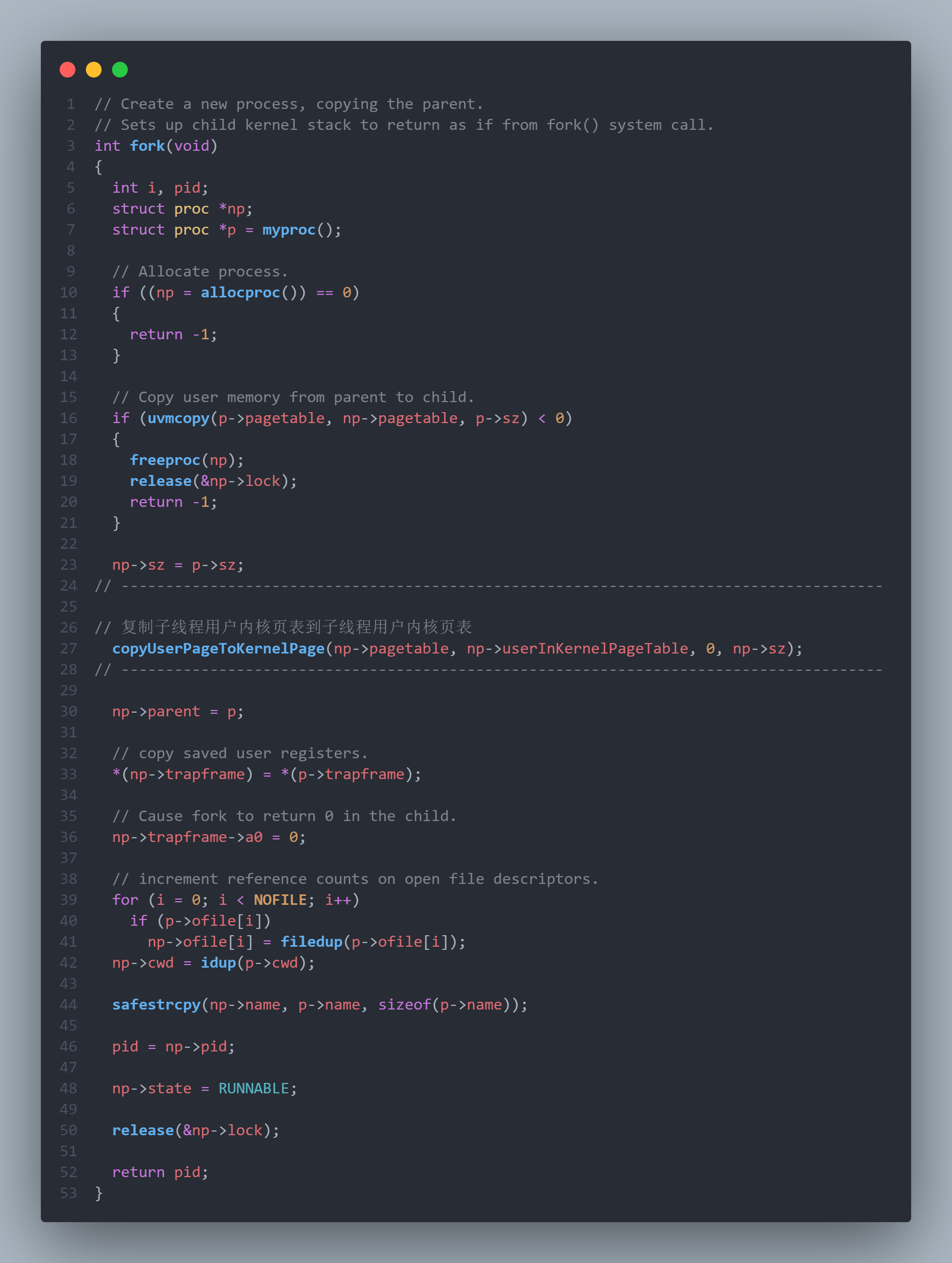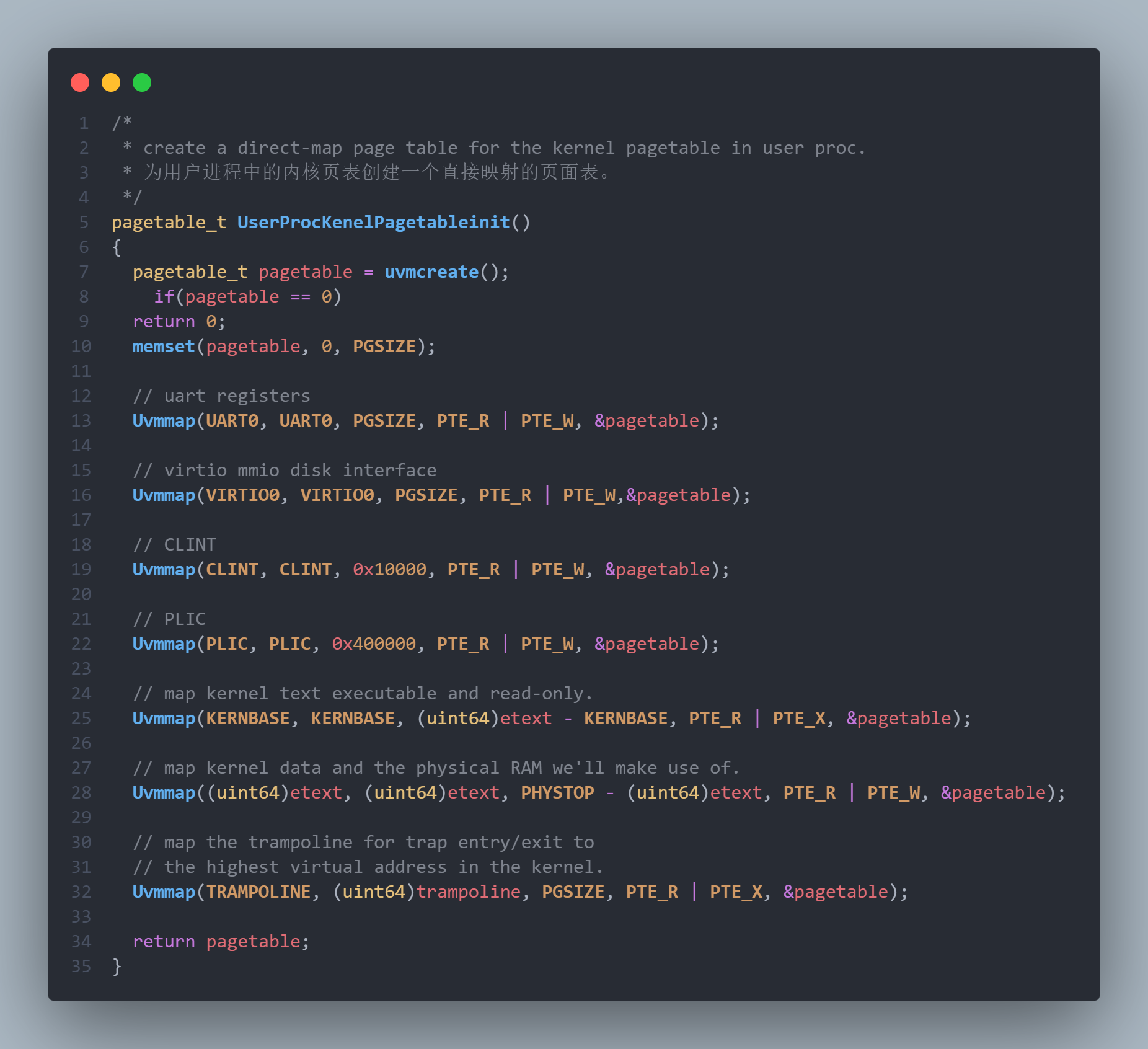 - 直接进行复制,仿照 kvminit 初始化全局内核页表的方式,对每个进程的内核页表进行映射