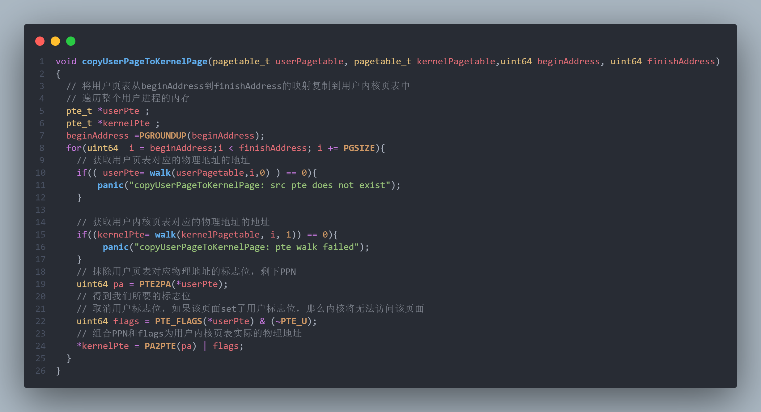- 我们的工作是将用户空间的映射添加到每个进程的内核页表(上一节中创建),以允许copyin(和相关的字符串函数copyinstr)直接解引用用户指针(因为内核现在已经在使用每个进程的内核页表)。不需要通过复制,这样可以节省大量的性能。