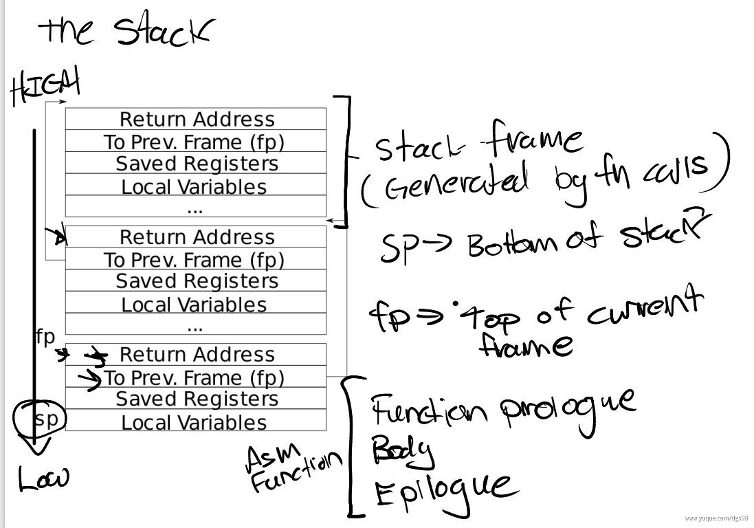 ) - XV6在内核中以页面对齐的地址为每个进程的栈分配一个页面****。你可以通过PGROUNDDOWN(fp) 和 PGROUNDUP(fp)(参见kernel/riscv.h)来计算栈页面的顶部和底部地址。这些数字对于