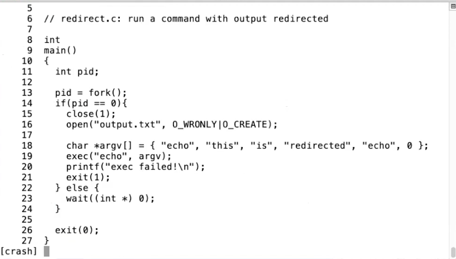 - 同时,父进程的文件描述符1并没有改变。所以这里先fork,再更改子进程的文件描述符,再执行 echo 来输出。这是Unix中的常见的用来重定向指令的输入输出的方法,这种方法同时又不会影响父进程的输入输出。因为我们不会想要重定向Shell的输出,我们只想重定向子进程的输出。