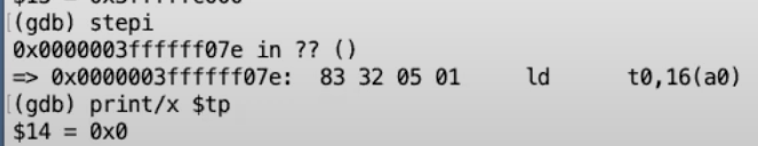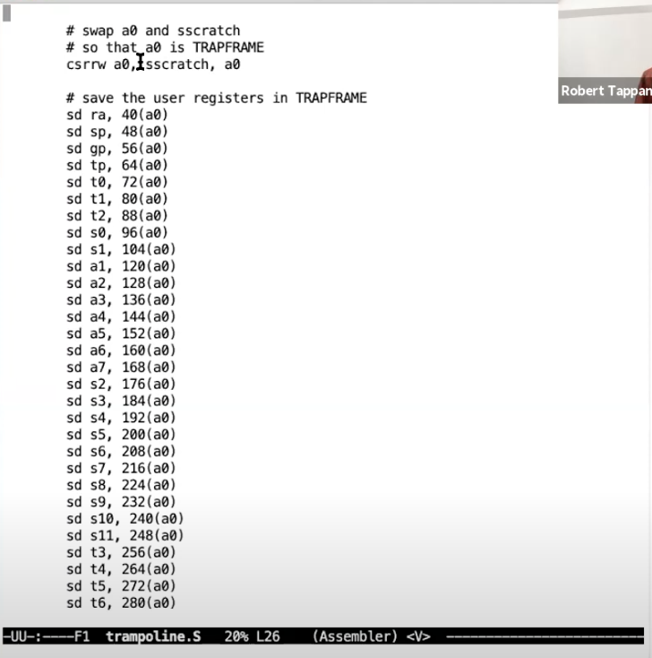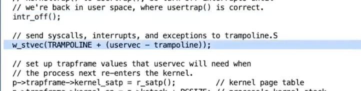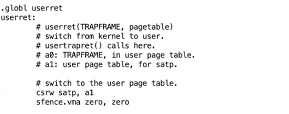 - 我们现在还没有在trampoline代码中,我们现在还在一个普通的C函数中,所以这里我们将page table指针准备好,并将这个指针作为第二个参数传递给汇编代码,这个参数会出现在a1寄存器。