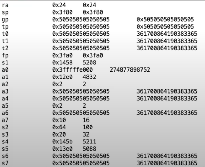 - 这些寄存器的值就是我们在最最开始看到的用户寄存器的值。例如SP寄存器保存的是user stack地址,这是一个在较小的内存地址;a1寄存器是我们传递给write的buffer指针,a2是我们传递给write函数的写入字节数。