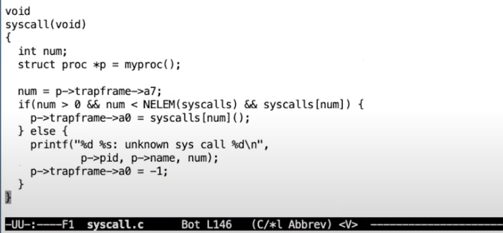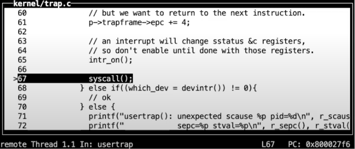 - 现在代码运行在C中,在usertrap这个C函数中,我们执行了一个叫做syscall的函数。