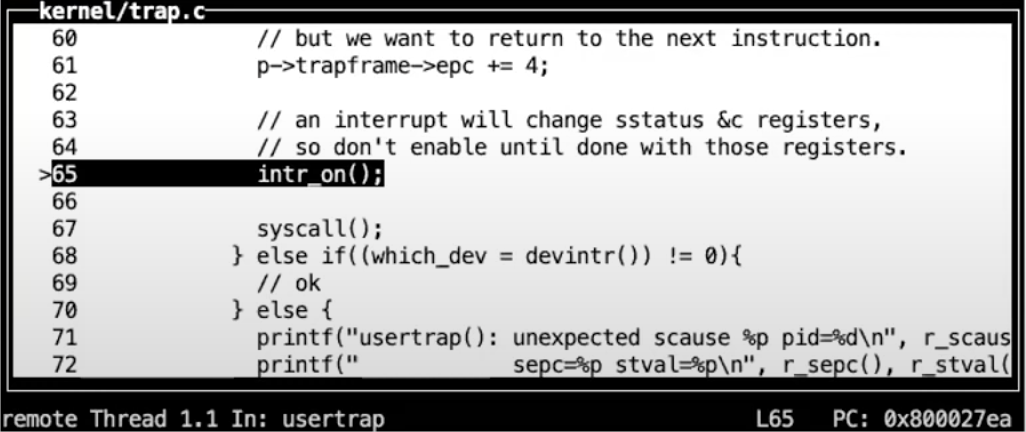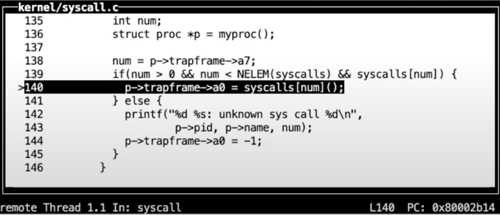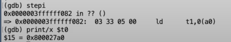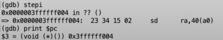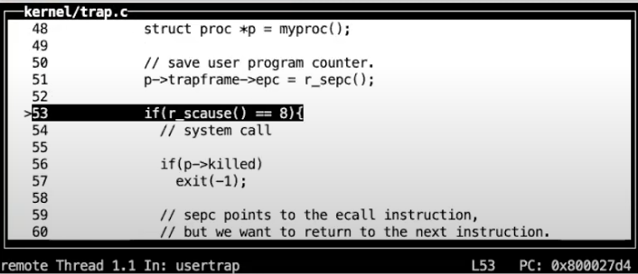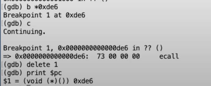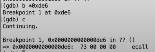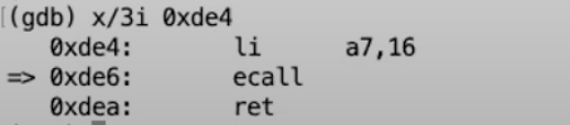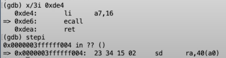 从gdb可以看出,我们下一条要执行的指令就是ecall。我们来检验一下我们是否真的在我们认为的位置
