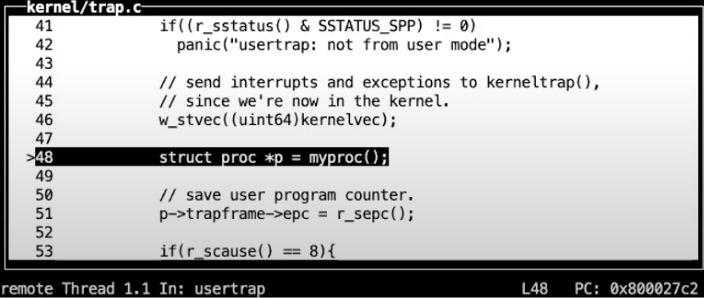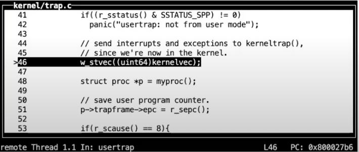 - 在这个汇编函数中,代码执行跳转到了由C语言实现的函数usertrap中,这个函数在trap.c中。