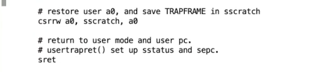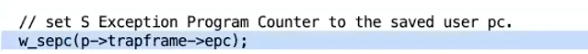 - userret() 的最后执行了 sret 指令。这条指令会将程序计数器设置成 SEPC 寄存器的值。