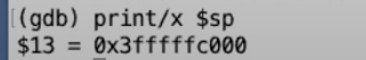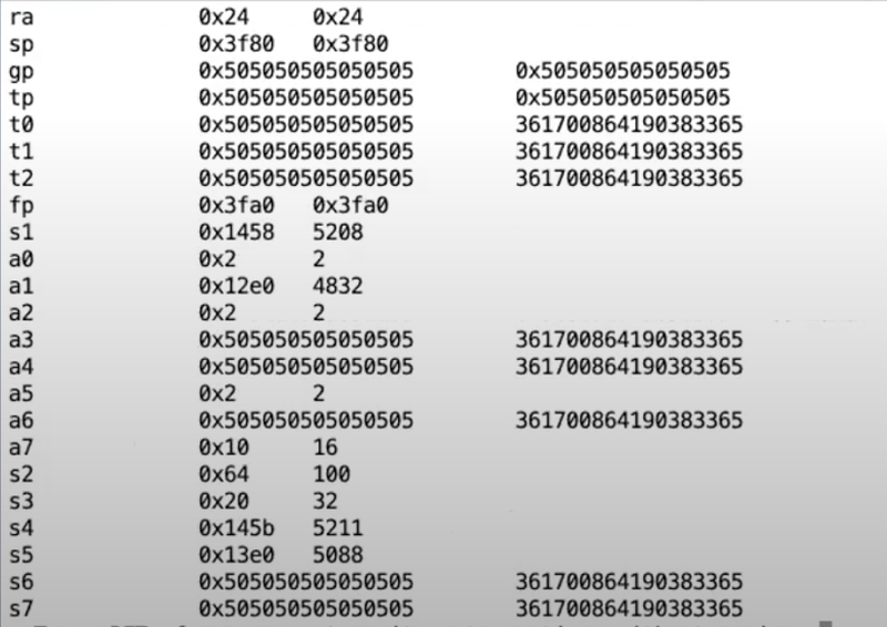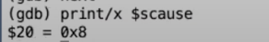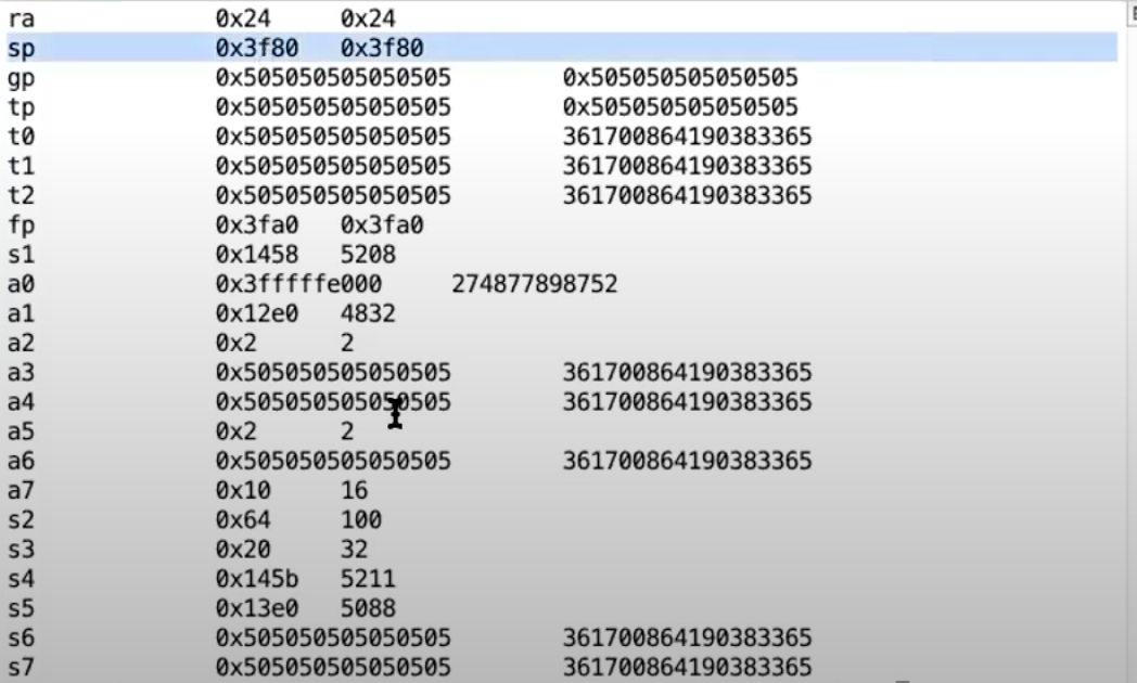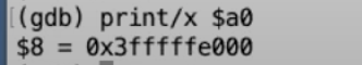 有一件事情需要注意,上图的寄存器中,程序计数器(pc)和堆栈指针(sp)的地址现在都在距离0比较近的地址,这进一步印证了当前代码运行在用户空间,因为用户空间中所有的地址都比较小。但是一旦我们进入到了内核,内核会使用大得多的内存地址。