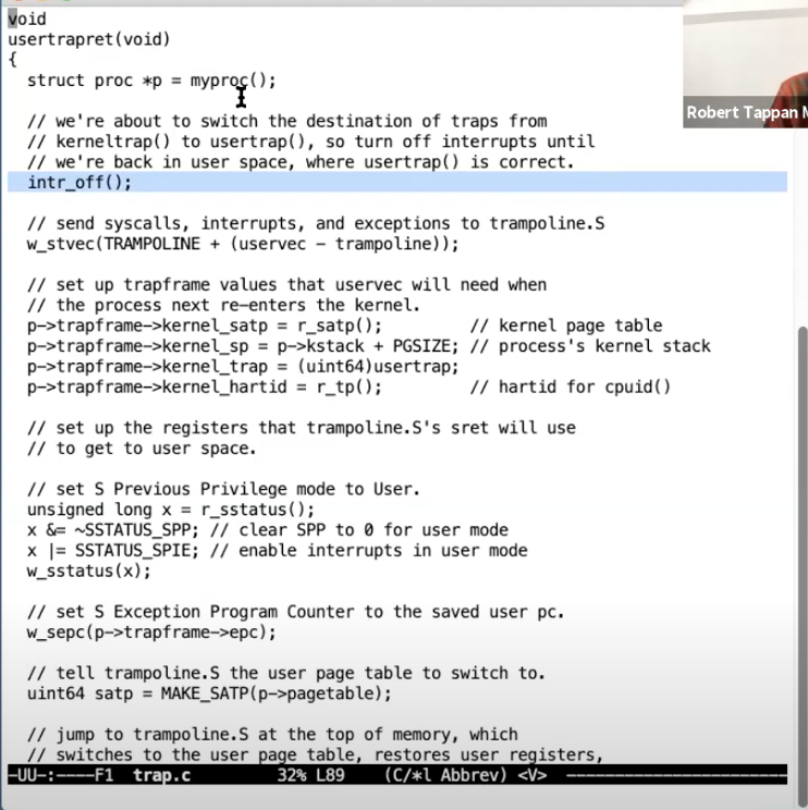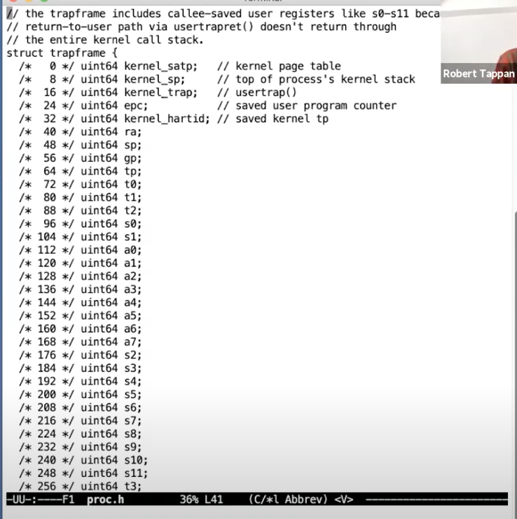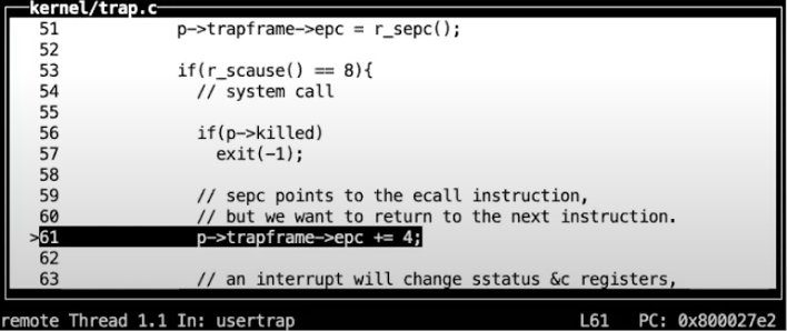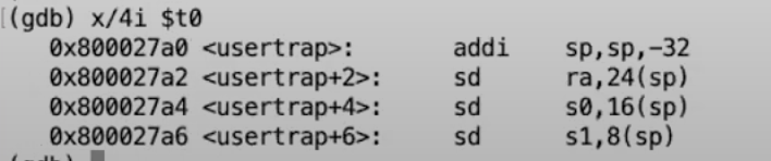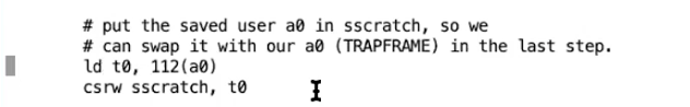 - a0寄存器现在还是个例外,它现在仍然是指向trapframe的指针,而不是保存了的用户数据。