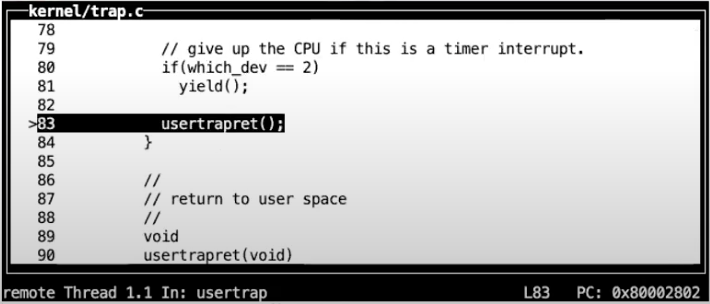 - 因为我们现在相当于在ECALL之后中断了用户代码的执行,为了用户空间的代码恢复执行,需要做一系列的事情。在syscall函数中,会调用一个函数叫做usertrapret,它也位于trap.c中,这个函数完成了部分方便在C代码中实现的返回到用户空间的工作。