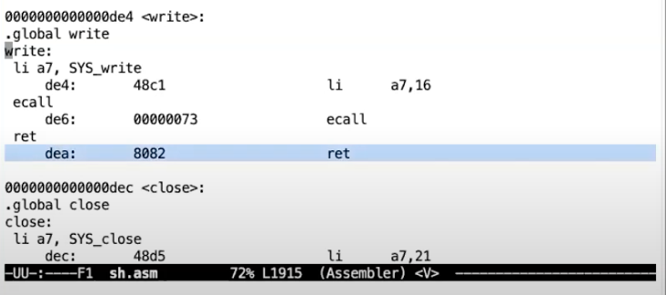 这是一个较小的指令地址,非常像是在用户内存中。如果我们查看sh.asm,可以看到这个地址是write函数的ret指令地址。