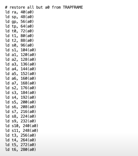 - 在这里 a0 是 trapframe 的地址,因为C代码 usertrapret() 中将trapframe地址作为第一个参数传递过来了。112是a0寄存器在trapframe中的位置。