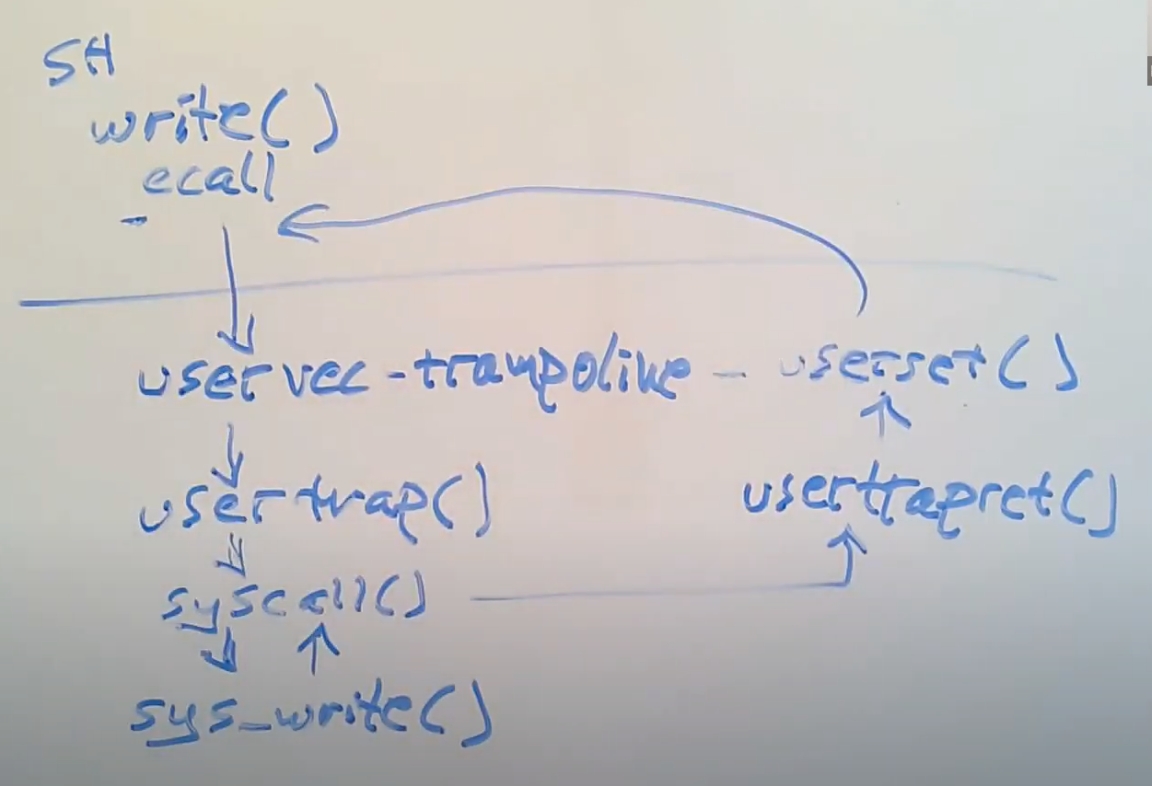 但是实际上,write通过执行ECALL指令来执行系统调用。ECALL指令会切换到具有supervisor mode的内核中。