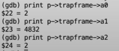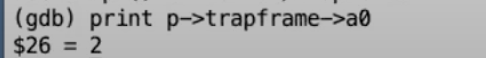 注:这里有点绕,本质就是通过当前的a0寄存器找出 trapframe, 再找出存放在 trapframe 中的原本的 a0 寄存器的值