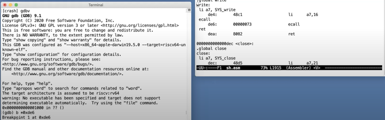 为了展示这里的系统调用,在ecall指令处放置一个断点****,为了能放置断点,我们需要知道ecall指令的地址,我们可以通过查看由XV6编译过程产生的sh.asm找出这个地址。sh.asm是带有指令地址的汇编代码(注,asm文件3.7有介绍)。我这里会在ecall指令处放置一个断点,这条指令的地址是0xde6。