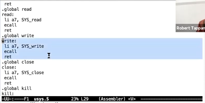 - 它首先将SYS_write加载到a7寄存器,SYS_write是常量16。这里告诉内核,我想要运行第16个系统调用—write。