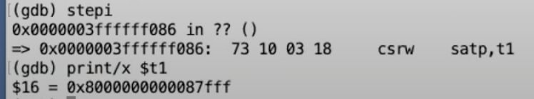 - 在执行**csrw satp, a1 **之前,page table 应该还是巨大的kernel page table。