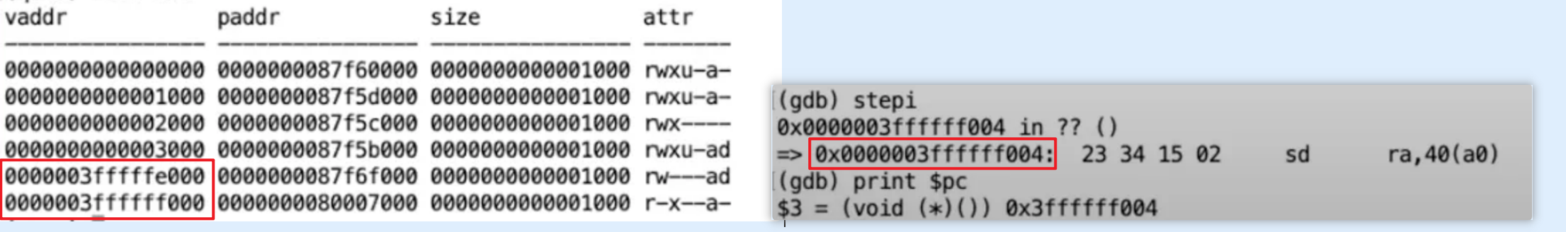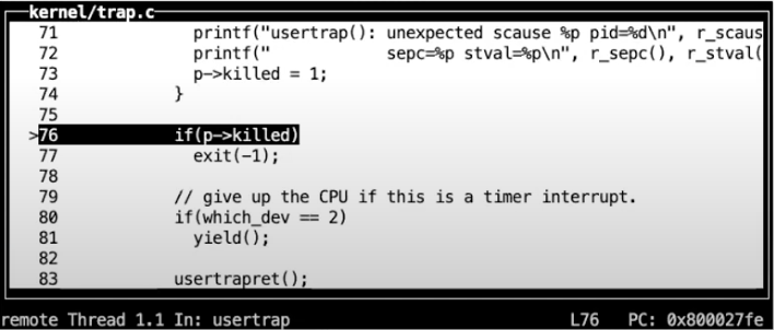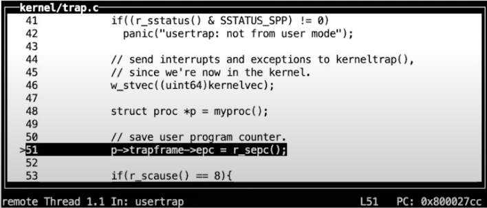 - 这是因为 user page table 也映射了trampoline page,所以程序还能继续执行而不是崩溃。(注,sfence.vma是清空页表缓存,详见4.4)。