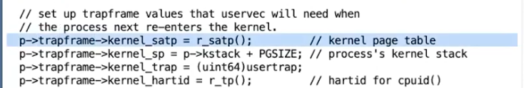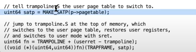 - 接下来,我们根据 user page table 地址生成相应的SATP值,这样我们在返回到用户空间的时候才能完成page table的切换。实际上,我们会在汇编代码trampoline 中完成page table的切换,并且也只能在trampoline中完成切换,因为只有trampoline中代码是同时在用户和内核空间中映射。